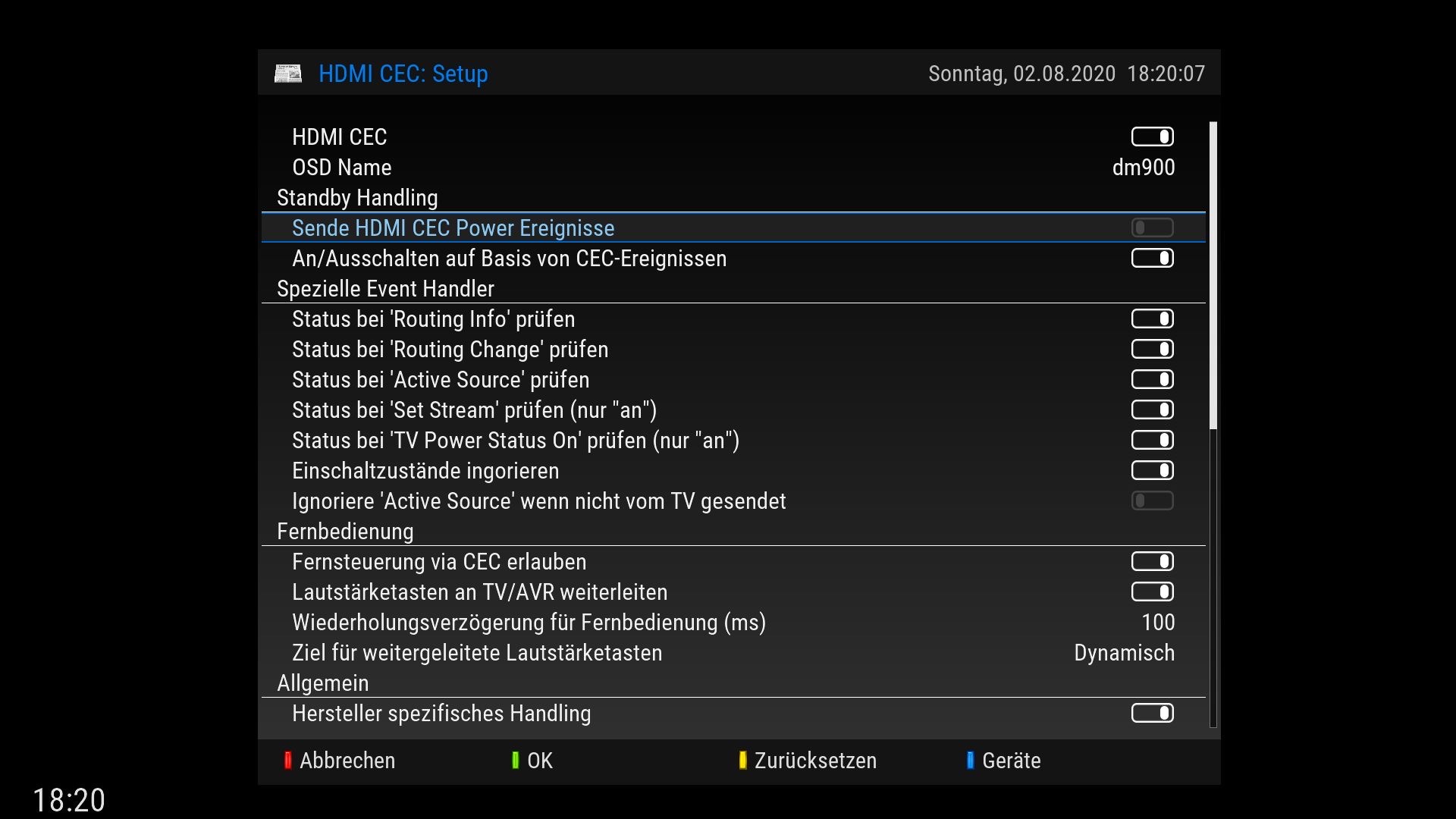 Ich habe zwei CEC Einstellungen geändert, die dafür sorgen, dass Dir die DM nicht beim hochfahren dazwischen funkt. Der  TV bleibt eingeschaltet und auch bei der Signalweitergabe zum A/V Receiver und TV wird nichts gestört.
