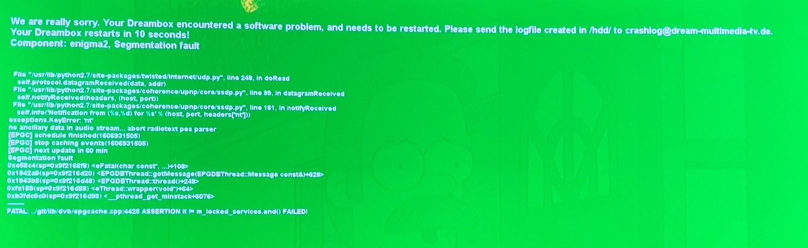 Nach einem Neustart der Box, läuft die Box ca. 10 Sekunden und stürtz dann mit einem Greenscreen ab und das in "Dauerschleife".