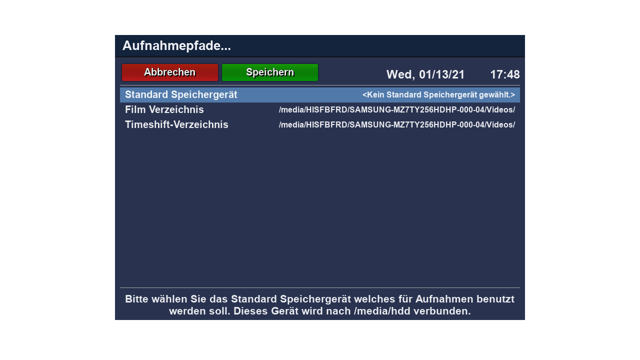 Das Aufnahmeverzeichnis bleibt entsprechend leer, auch wenn eine Aufnahme im Filmverzeichnis gespeichert wurde. Weil das so ist, kann ich auch den Cutlisteditor und Moviecut nicht zum Einsatz bringen, denn die funktionieren anscheinend nur im Aufnahmeverzeichnis. Hat jemand eine Ahnung, wie ich dem Standard-Speichergerät sonst noch einen Verzeichnispfad zuordnen kann?