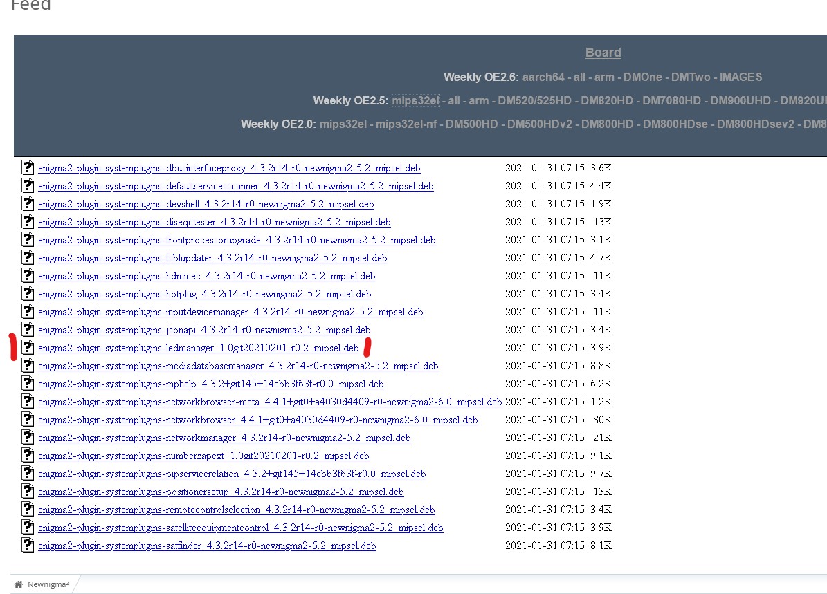 Reading package lists...Building dependency tree...Reading state information...The following NEW packages will be installed: enigma2-plugin-systemplugins-ledmanager0 upgraded, 1 newly installed, 0 to remove and 0 not upgraded.Need to get 3968 B of archives.After this operation, 0 B of additional disk space will be used.Err feed.newnigma2.to/daily/oe2.5/deb/mips32el/ ./ enigma2-plugin-systemplugins-ledmanager 1.0git20210125-r0.2 404 Not Found [IP: 176.10.100.220 80]E: Failed to fetch feed.newnigma2.to/daily/oe2.5/…t20210125-r0.2_mipsel.deb 404 Not Found [IP: 176.10.100.220 80]E: Unable to fetch some archives, maybe run apt-get update or try with --fix-missing?