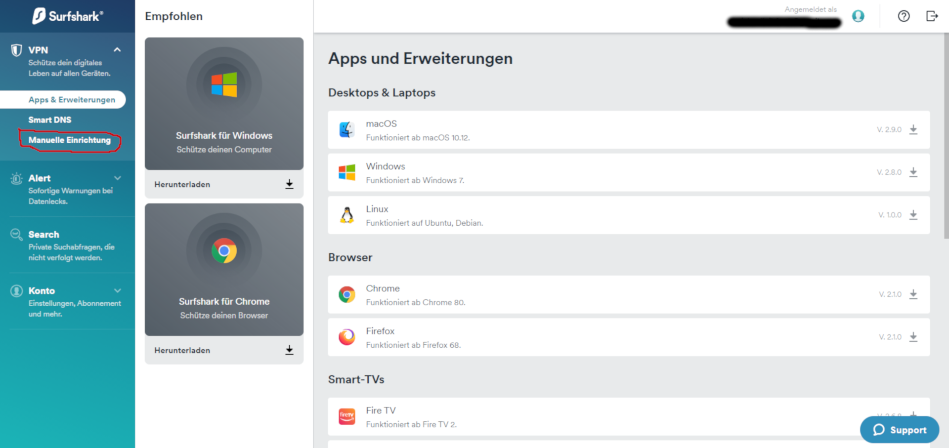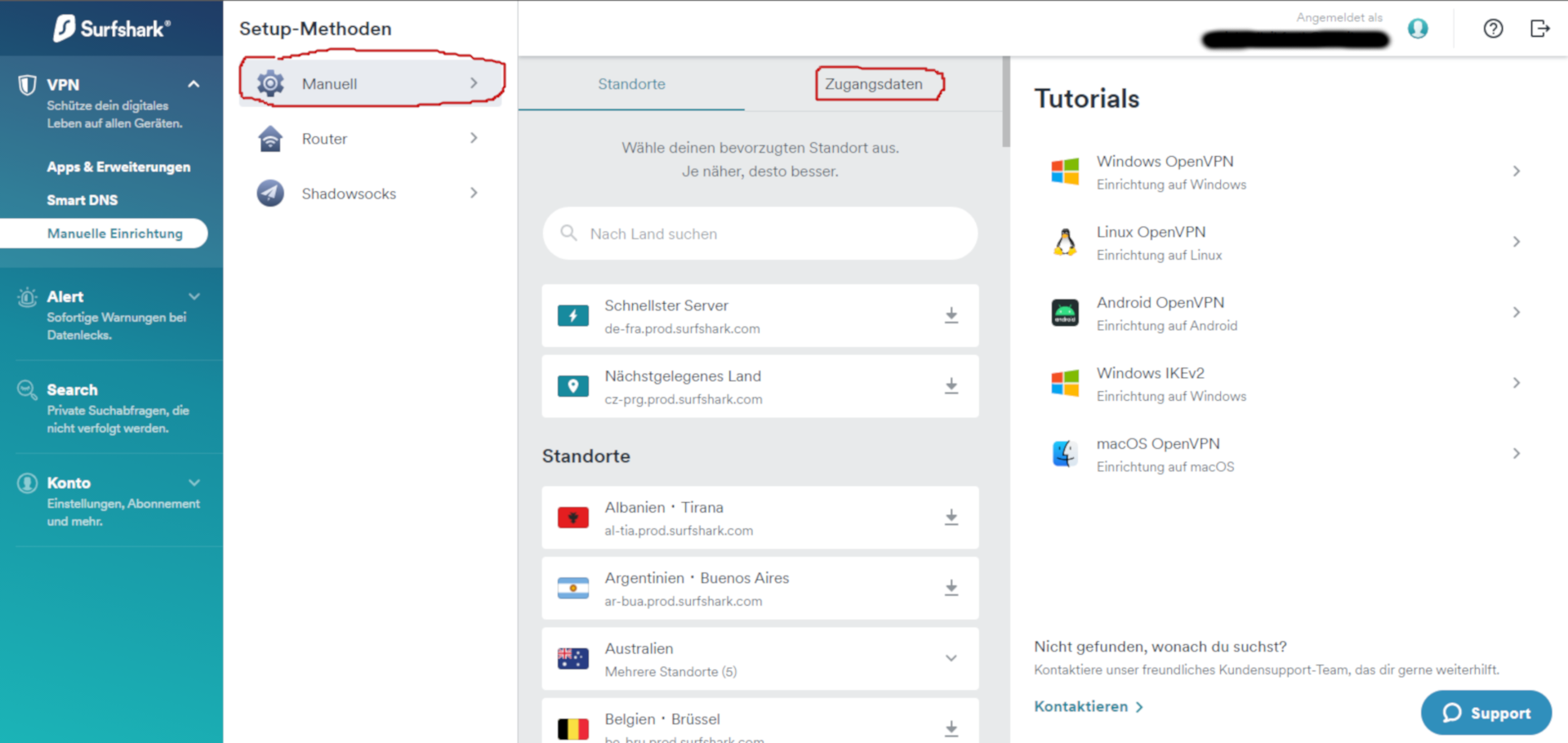 Die Zugangsdaten für die VPN-Verbindung finden Sie im Kontrollzentrum von SurfShark.