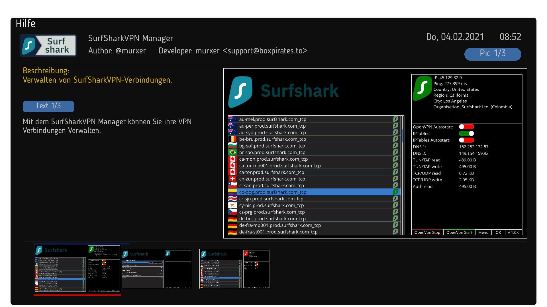 Mit diesem Plugin habt ihr die Möglichkeit den VPN-Provider SurfSharkVPN, auf eurer Box zu nutzen, nur möglich mit einem Abo des Provider.