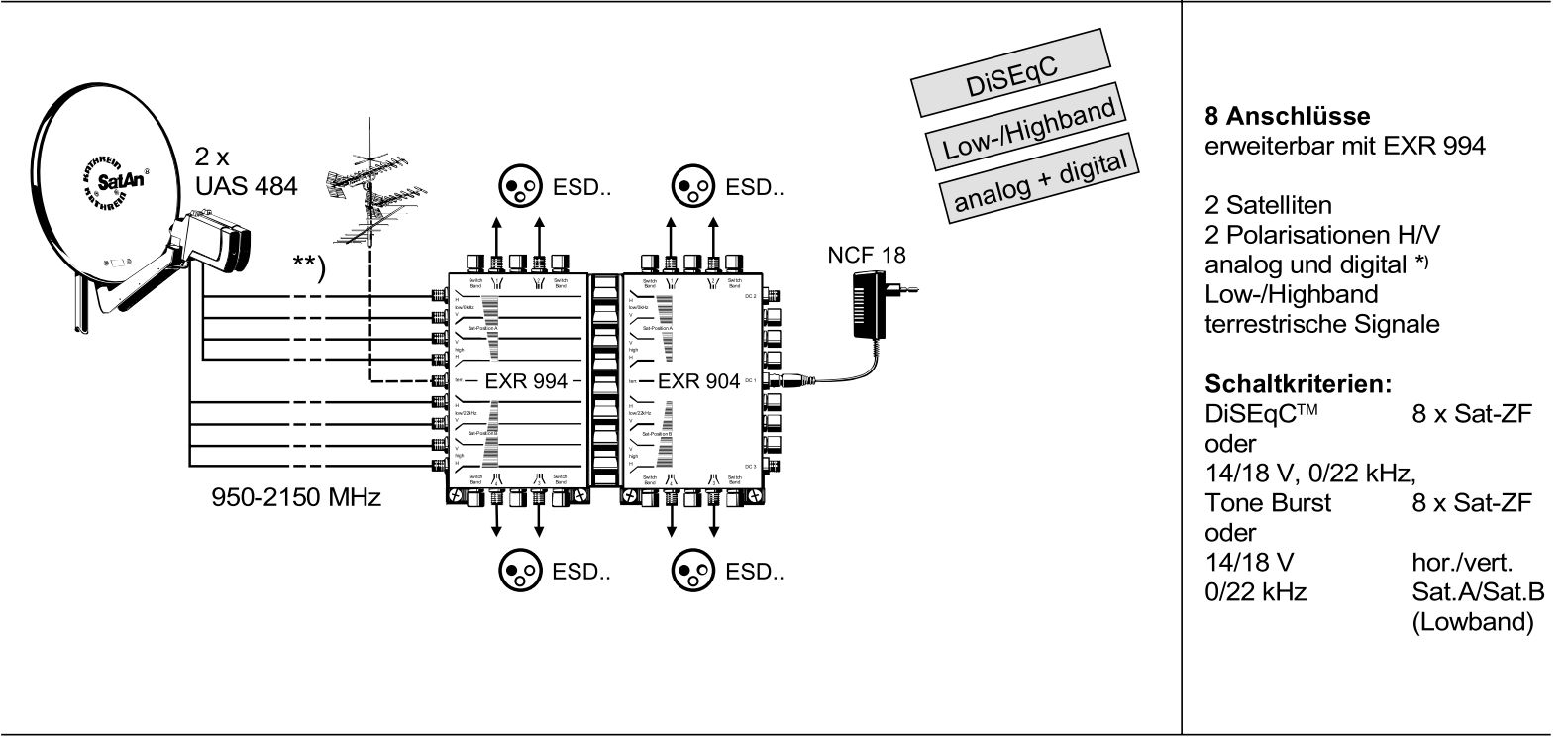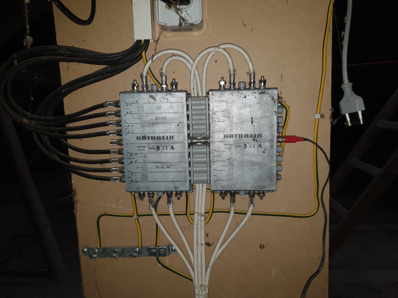 • Der Receiver schickt rückwärts über das Satkabel variierende Spannungen (13 oder 17 V) zzgl. eines Tonsignals und bei entsprechender Konfiguration auch verschiedene DiSeqC-Steuersignale in Richtung LNB bzw. Multischalter. Das ist zwingend erforderlich um die verschiedenen Empfangsbänder und ggf. Satelliten auswählen zu können. Ohne LNB-Spannung geht es also nicht so ohne Weiteres. Die Verteilung auf dem Dachboden entspricht einer Standard-Anschaltung für 2 Satelliten.
