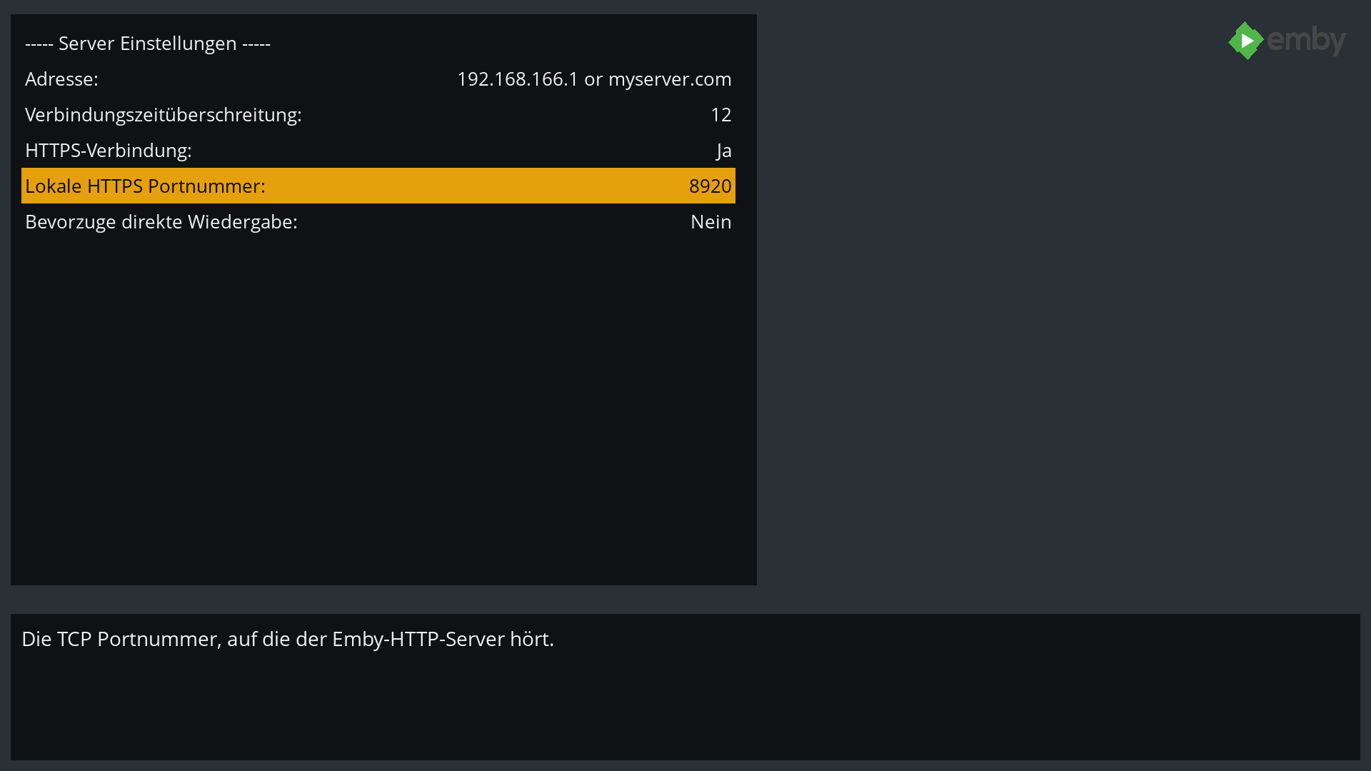 Lass dich bitte nicht vom "Lokale HTTPS Portnummer:" täuschen, hier hab ich in der Emby Übersetzung nichts besseres gefunden.