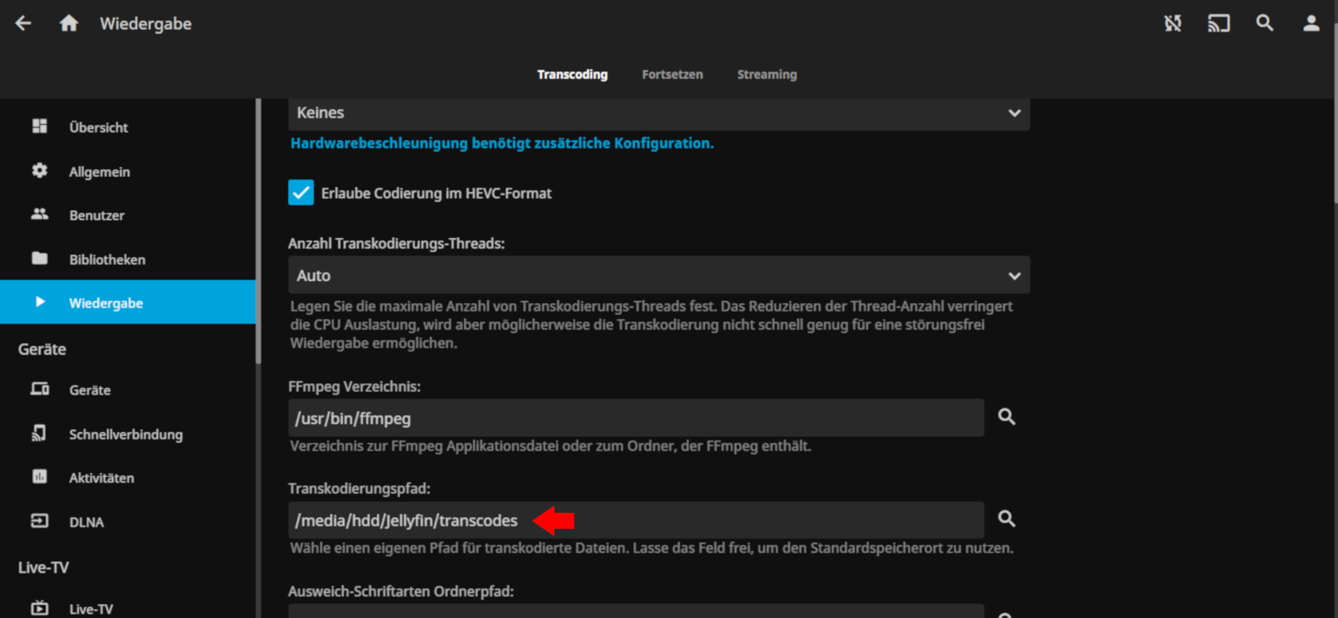/media/hdd/jellyfin/Media hier hab ich mein Film Ordner und Serien Ordner erstellt.Jetzt könnt ihr die Einstellungen im Browser Anpassen und es werden dann alle Daten ausgelagert.