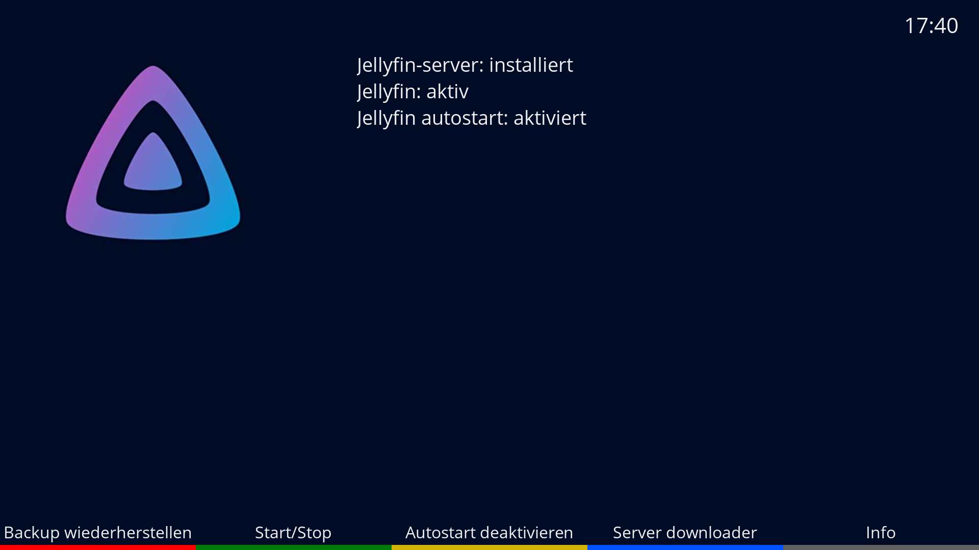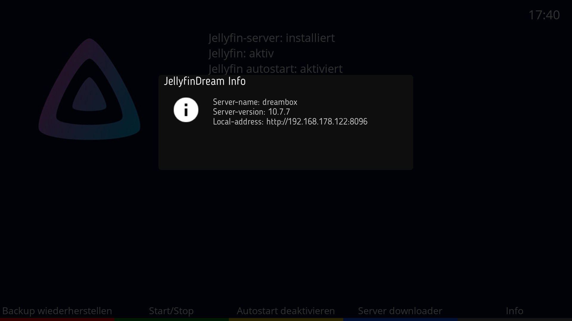 Backup-Wiederherstellung Funktion belegtDie Info Taste hat 2 Funktionen, wenn der Jellyfin Server aktiv ist, bekommt ihr Infos über den Server.