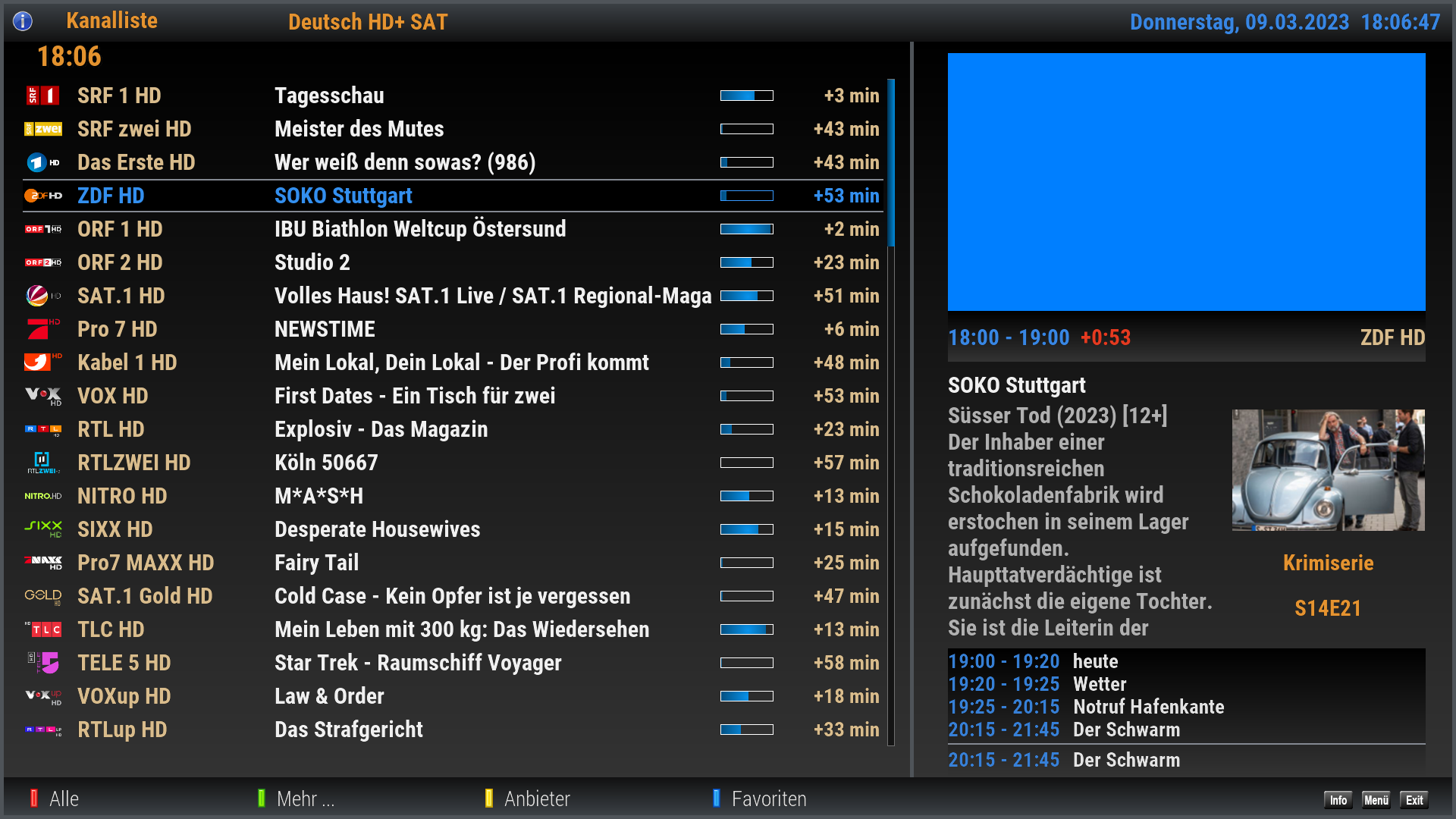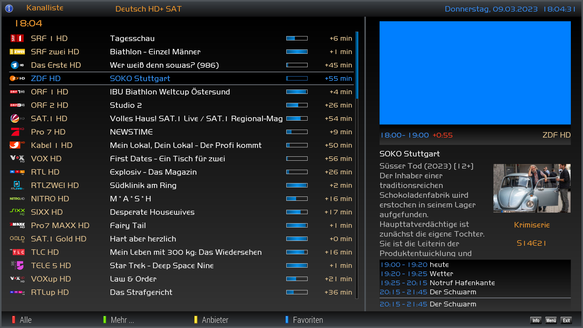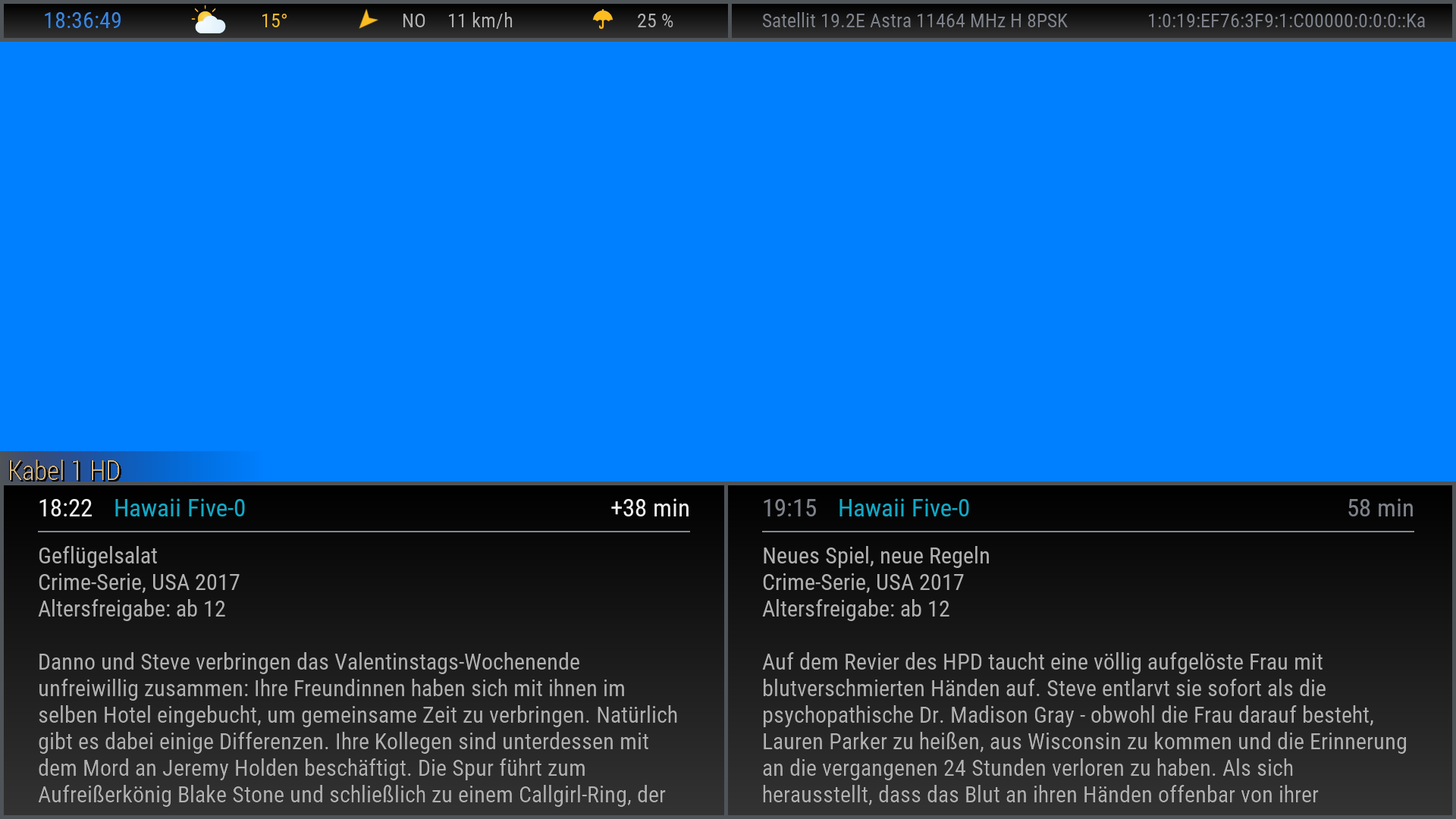 • Die Info ist so geskinnt und kann nicht geändert werden. Es werden alle verfügbaren Informationen zur Sendung angezeigt. Mit der gelben Taste öffnet der EPG im Fullscreen, hierfür kann auch im MerlinSkinThemes -> EPGSelection "miniTV" ausgewählt werden.