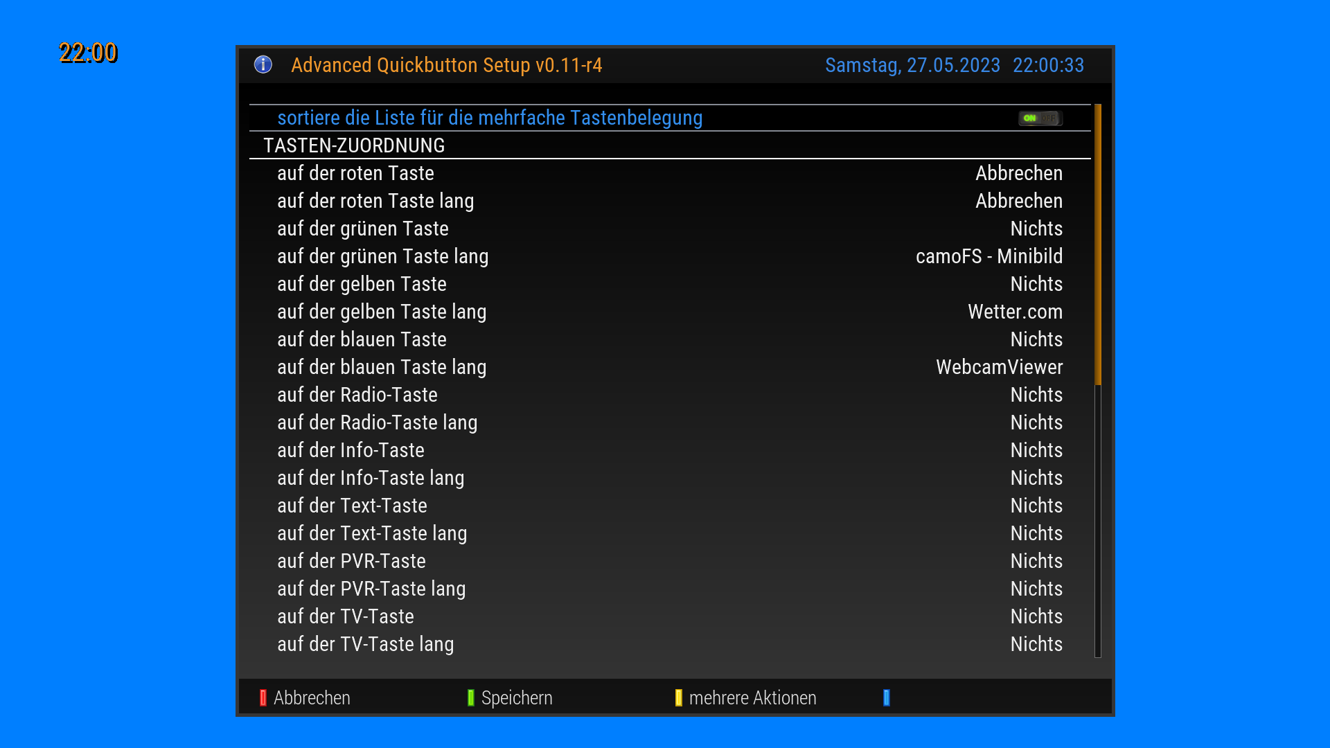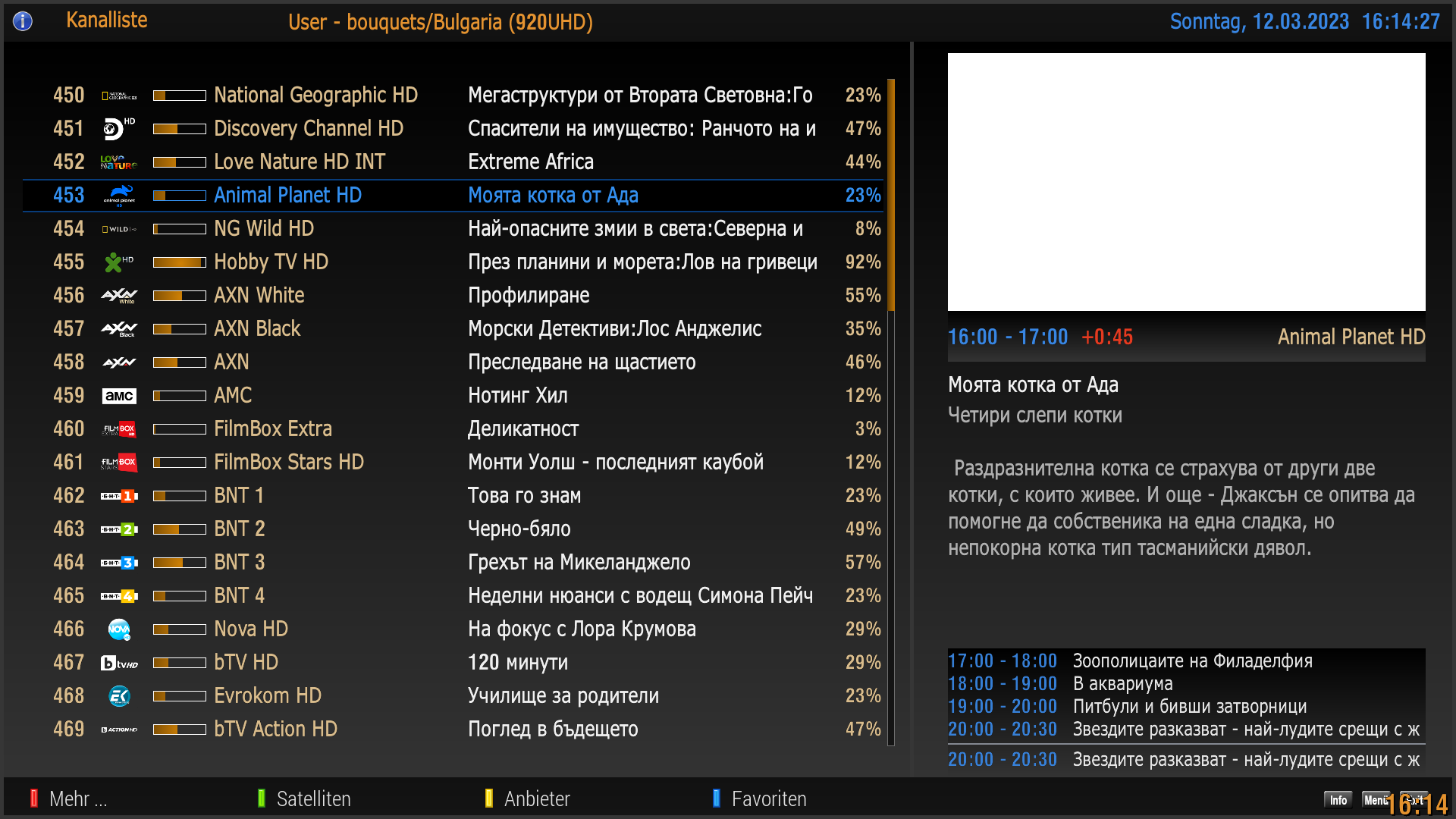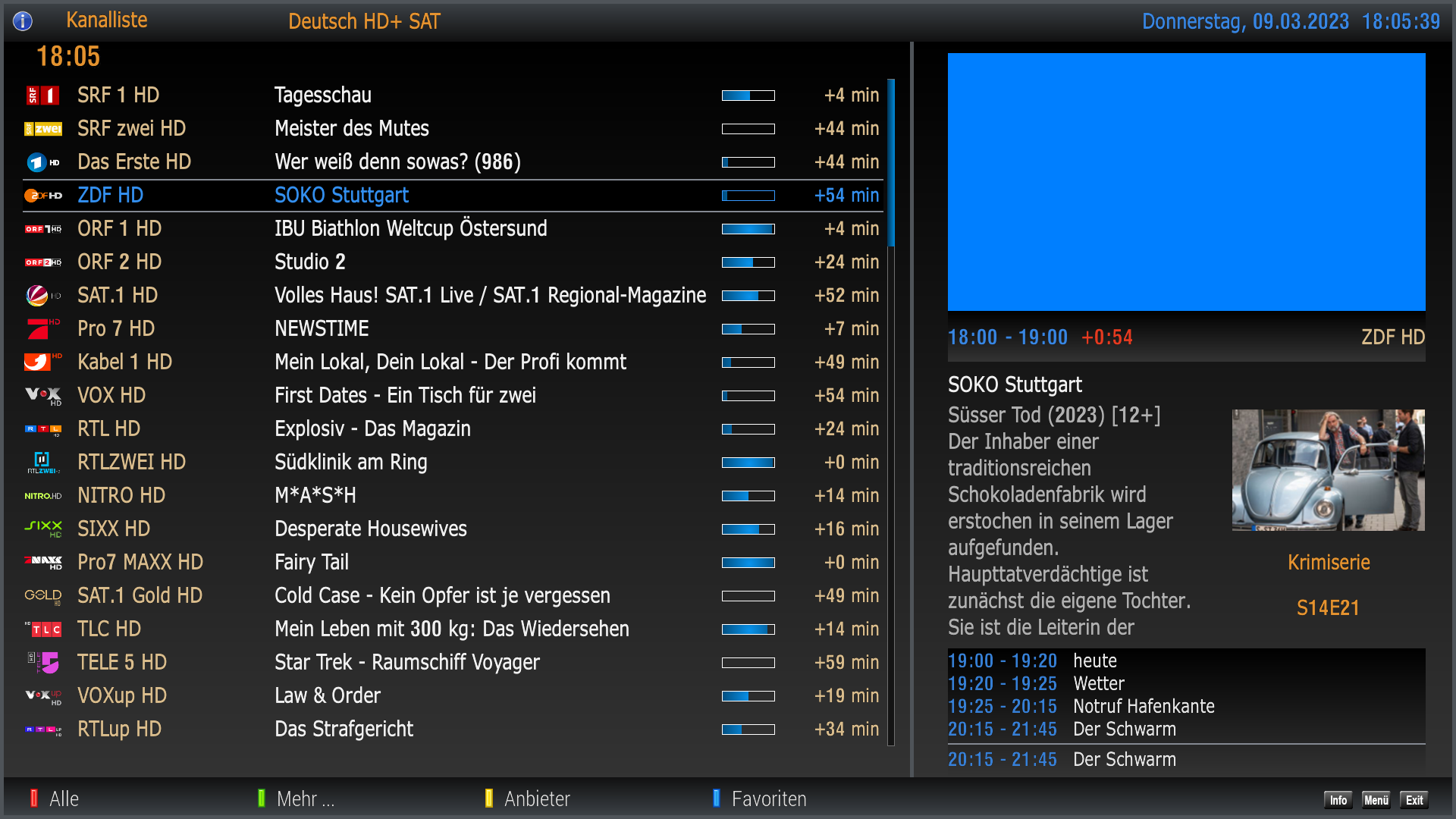 • Die Info ist so geskinnt und kann nicht geändert werden. Es werden alle verfügbaren Informationen zur Sendung angezeigt. Mit der gelben Taste öffnet der EPG im Fullscreen, hierfür kann auch im MerlinSkinThemes -> EPGSelection "miniTV" ausgewählt werden.