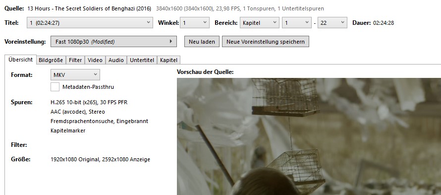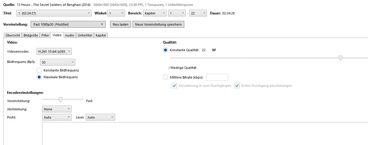 Kodierungseinstellungen : cpuid=1111039 / frame-threads=4 / numa-pools=16 / wpp / no-pmode / no-pme / no-psnr / no-ssim / log-level=2 / input-csp=1 / input-res=3840x2160 / interlace=0 / total-frames=0 / level-idc=0 / high-tier=1 / uhd-bd=0 / ref=3 / no-allow-non-conformance / no-repeat-headers / annexb / no-aud / no-hrd / info / hash=0 / no-temporal-layers / open-gop / min-keyint=25 / keyint=250 / gop-lookahead=0 / bframes=4 / b-adapt=2 / b-pyramid / bframe-bias=0 / rc-lookahead=20 / lookahead-slices=8 / scenecut=40 / radl=0 / no-splice / no-intra-refresh / ctu=64 / min-cu-size=8 / no-rect / no-amp / max-tu-size=32 / tu-inter-depth=1 / tu-intra-depth=1 / limit-tu=0 / rdoq-level=0 / dynamic-rd=0.00 / no-ssim-rd / signhide / no-tskip / nr-intra=0 / nr-inter=0 / no-constrained-intra / strong-intra-smoothing / max-merge=3 / limit-refs=1 / no-limit-modes / me=1 / subme=2 / merange=57 / temporal-mvp / no-hme / weightp / no-weightb / no-analyze-src-pics / deblock=0:0 / sao / no-sao-non-deblock / rd=3selective-sao=4 / early-skip / rskip / no-fast-intra / no-tskip-fast / no-cu-lossless / b-intra / no-splitrd-skip / rdpenalty=0 / psy-rd=2.00 / psy-rdoq=0.00 / no-rd-refine / no-lossless / cbqpoffs=0 / crqpoffs=0 / rc=abr / bitrate=75620 / qcomp=0.60 / qpstep=4 / stats-write=0 / stats-read=0 / ipratio=1.40 / pbratio=1.30 / aq-mode=2 / aq-strength=1.00 / cutree / zone-count=0 / no-strict-cbr / qg-size=32 / no-rc-grain / qpmax=69 / qpmin=0 / no-const-vbv / sar=1 / overscan=0 / videoformat=5 / range=0 / colorprim=2 / transfer=2 / colormatrix=2 / chromaloc=0 / display-window=0cll=0,0 / min-luma=0 / max-luma=1023 / log2-max-poc-lsb=8 / vui-timing-info / vui-hrd-info / slices=1 / no-opt-qp-pps / no-opt-ref-list-length-pps / no-multi-pass-opt-rps / scenecut-bias=0.05 / no-opt-cu-delta-qp / no-aq-motion / no-hdr / no-hdr-opt / no-dhdr10-opt / no-idr-recovery-sei / analysis-reuse-level=5 / scale-factor=0 / refine-intra=0 / refine-inter=0 / refine-mv=0 / refine-ctu-distortion=0 / no-limit-sao / ctu-info=0 / no-lowpass-dct / refine-analysis-type=0 / copy-pic=1 / max-ausize-factor=1.0 / no-dynamic-refine / no-single-sei / no-hevc-aq / no-svt / no-field / qp-adaptation-range=1.00