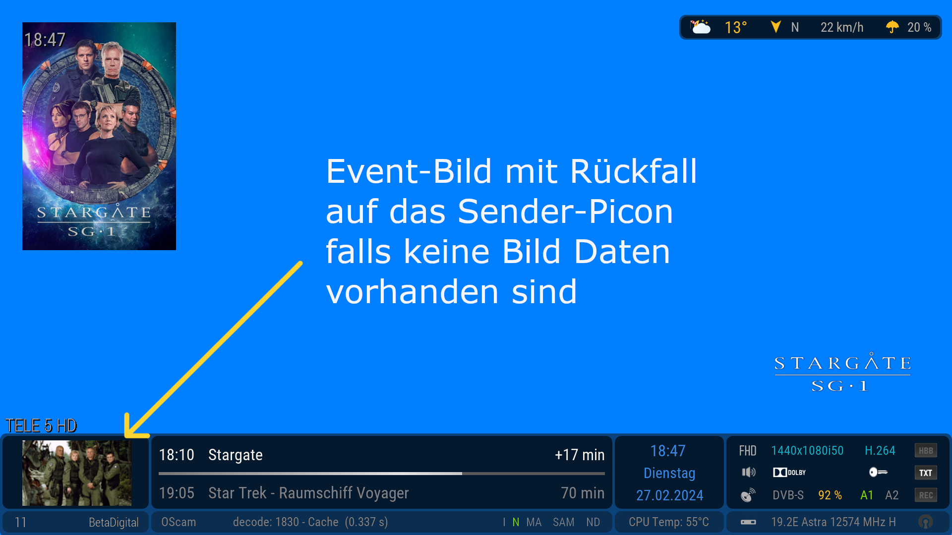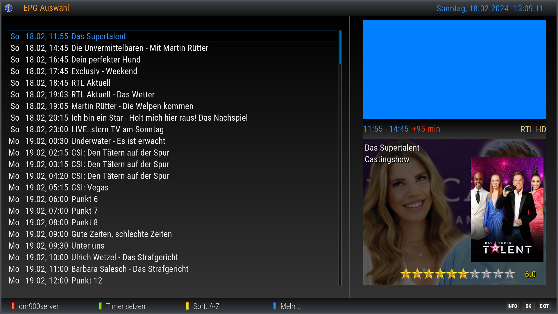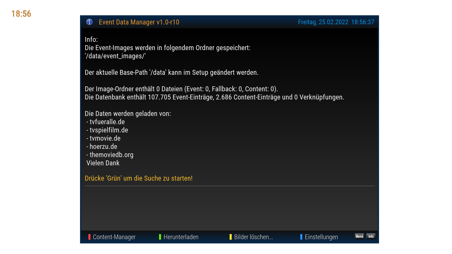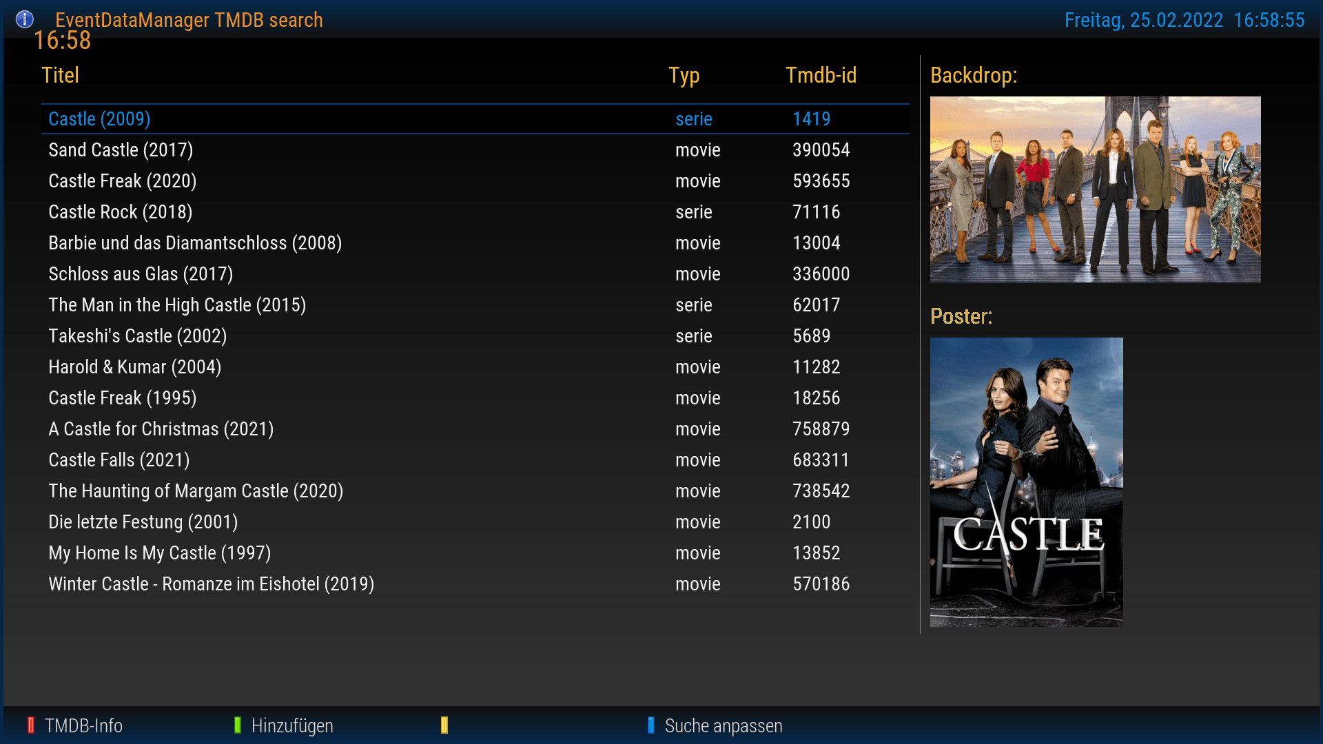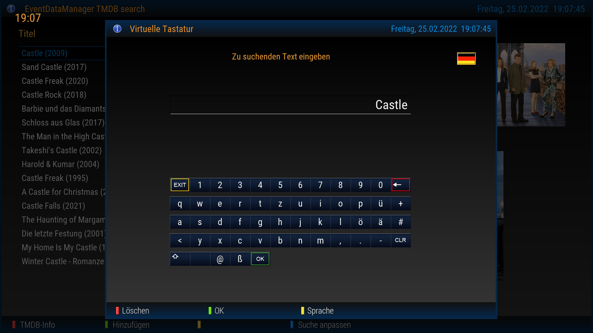 Über die Info Taste der FB kann im TV Betrieb der EDM EventScreen extra aufgerufen werden. Über die Blau Taste kommt man so auch direkt in die TMDB suche.