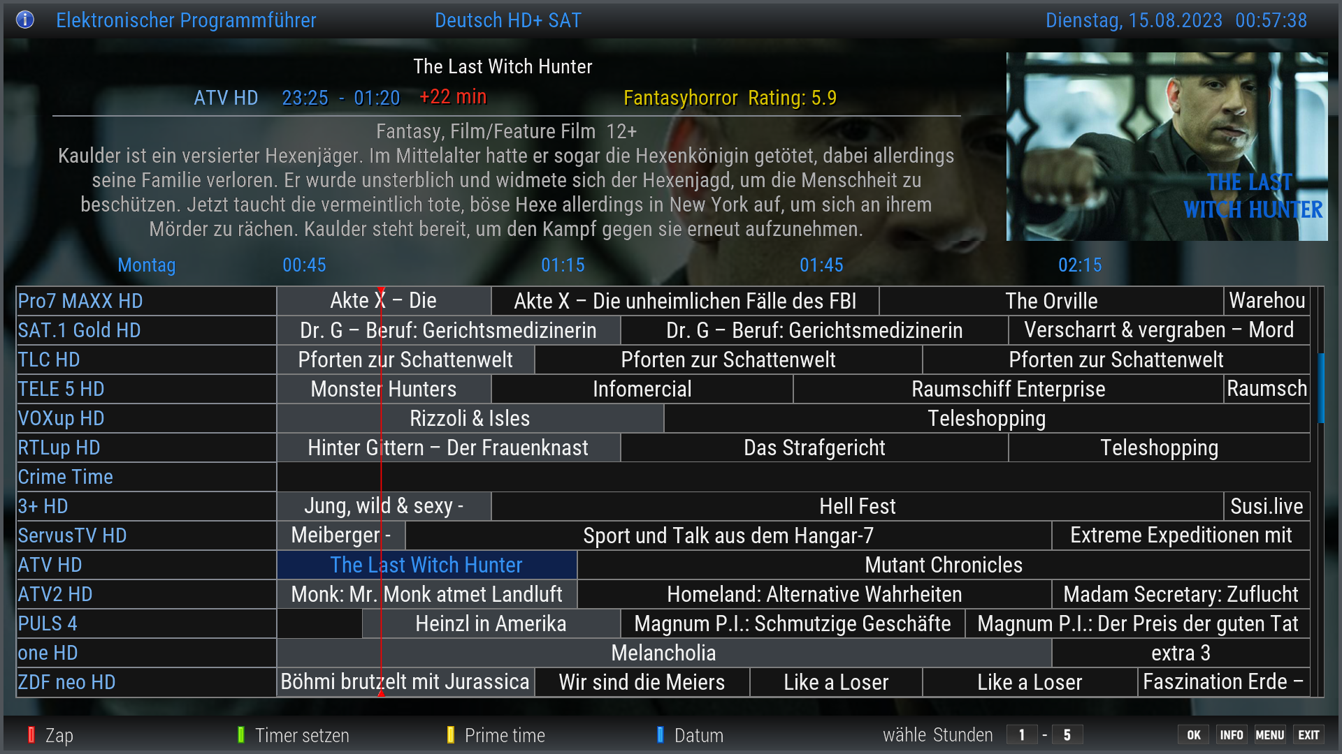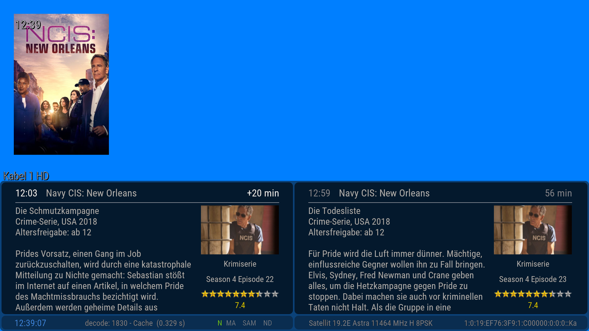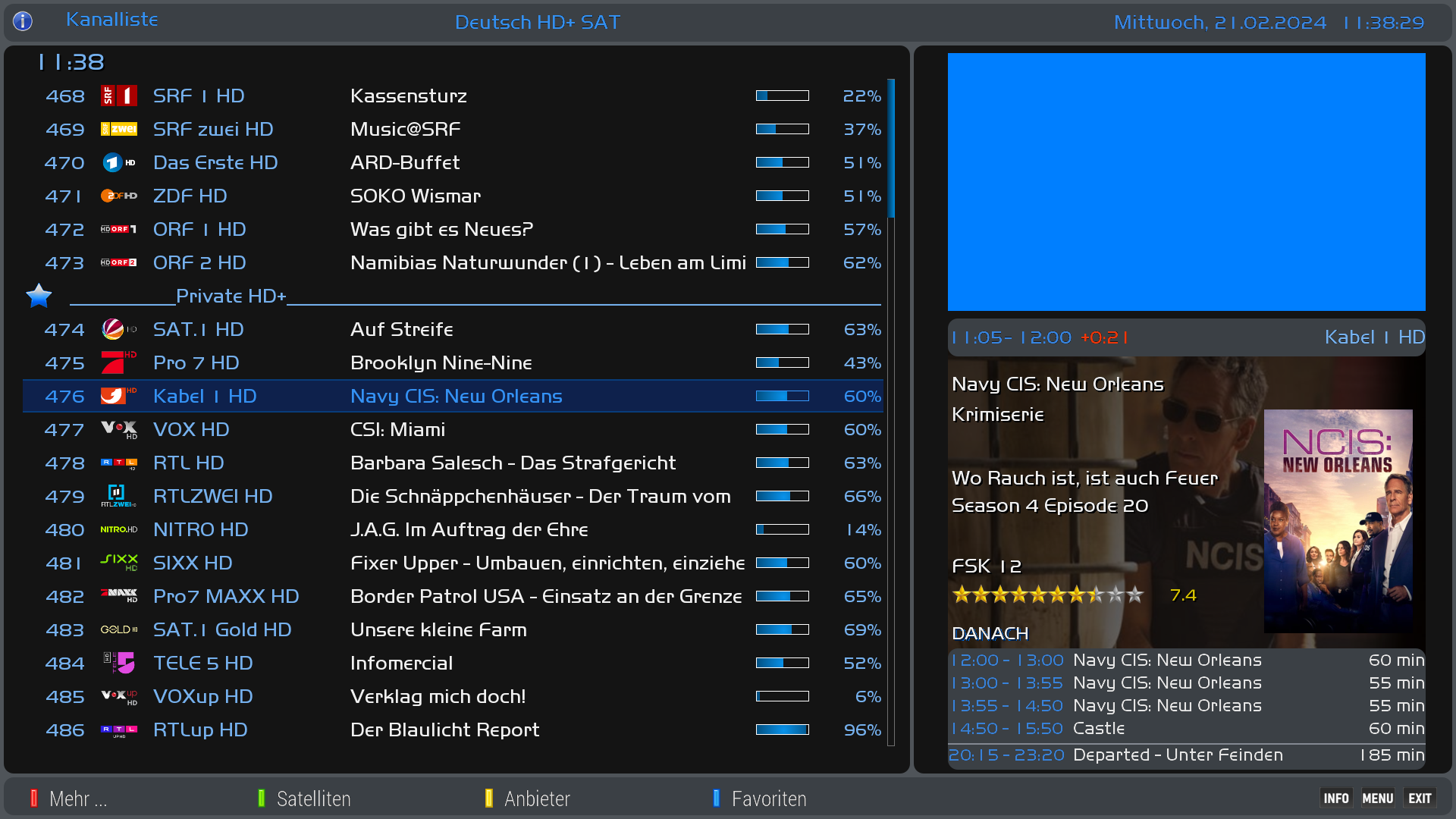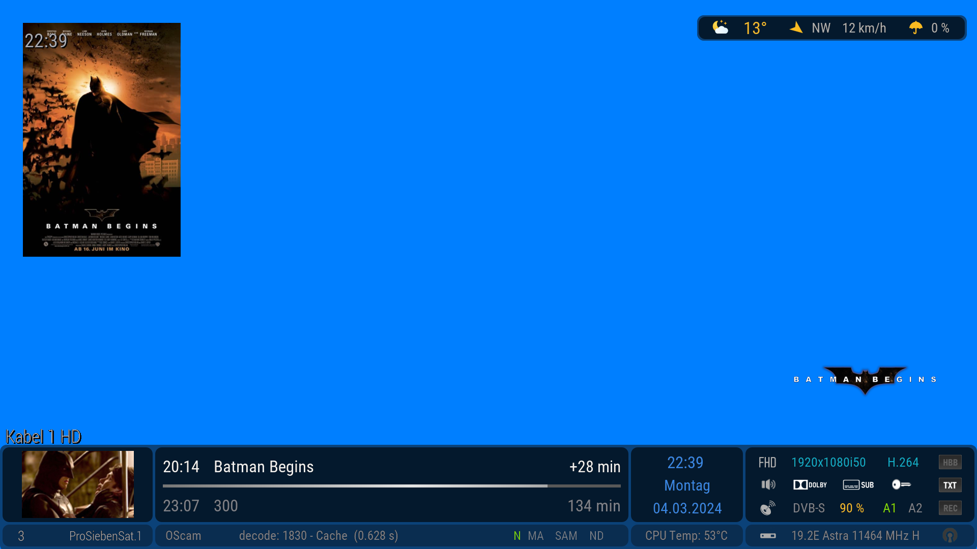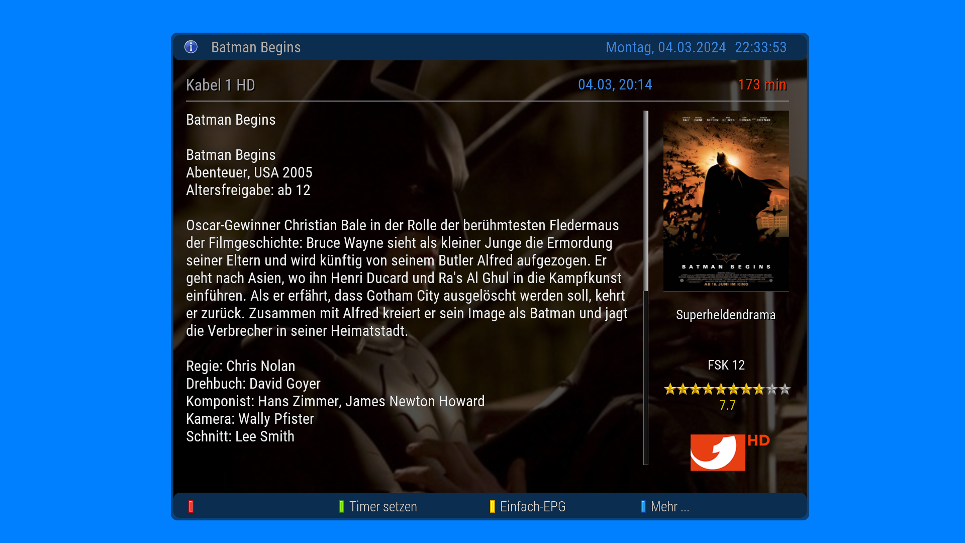 Über die Info Taste der FB kann im TV Betrieb der EDM EventScreen extra aufgerufen werden. Über die Blau Taste kommt man so auch direkt in die TMDB suche.