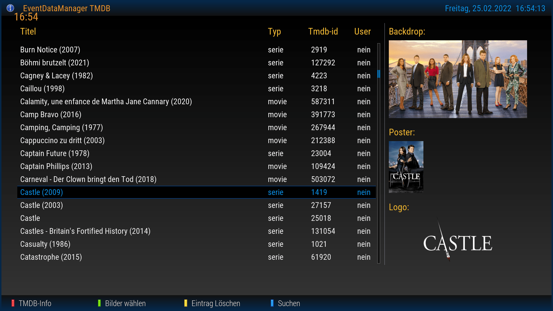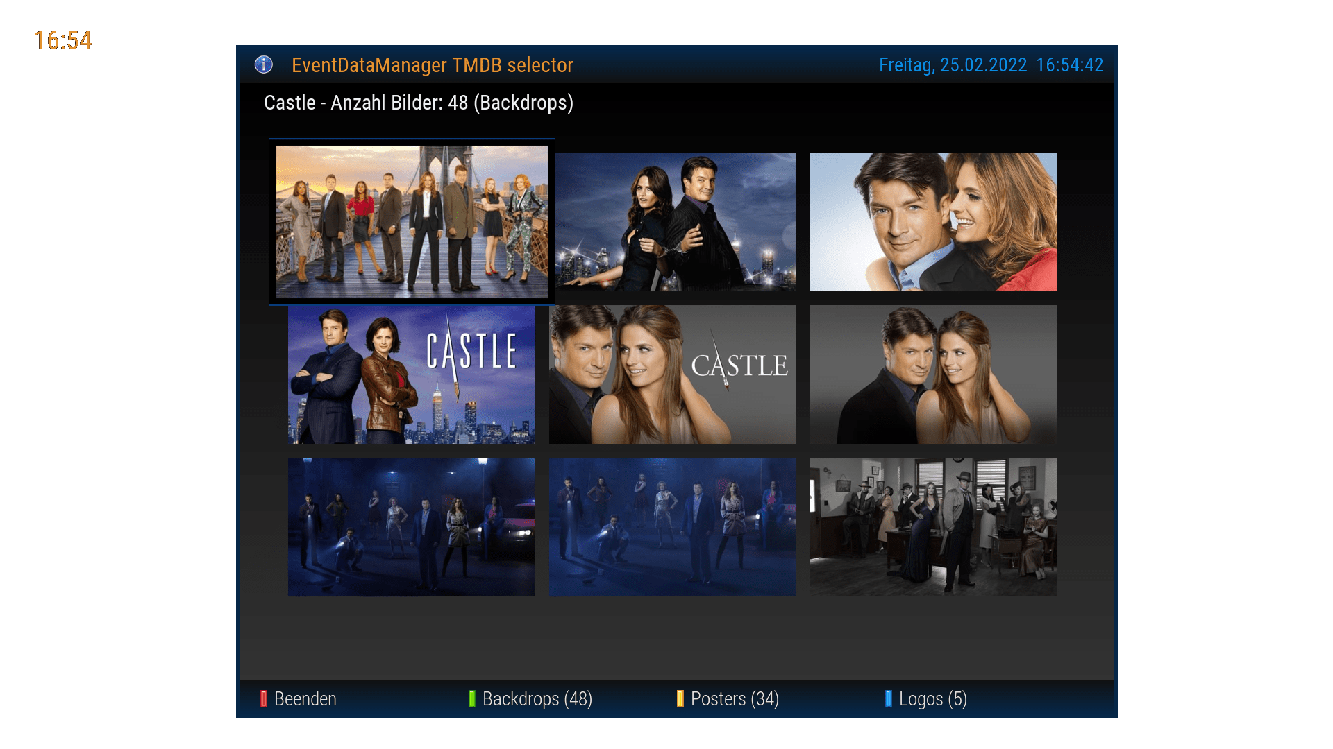 Über die GRÜNE Taste im Content - Manager können die bei TMDB verfügbaren Bilder aufgerufen werden, dabei gibt es die Auswahl für Backdrop, Poster sowie für Logos. Mit der OK Taste kann man ein bevorzugtes Bild als Hauptbild setzen, dabei wird die Userkennung auf (ja) gesetzt.
