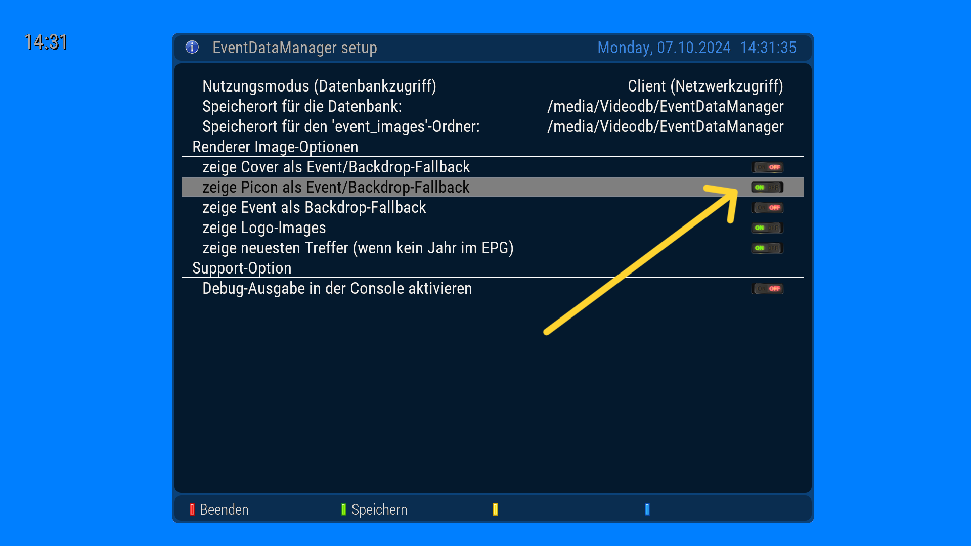 - neue Setup-Option "zeige Picon als Event/Backdrop-Fallback" (so kann unabhängig vom Skin mit dem EDM-Image-Renderer automatisch ein vorhandenes Picon angezeigt werden, falls ein Event-Image bzw. ein Backdrop nicht vorhanden ist)