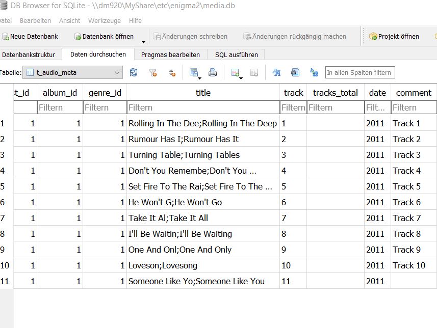 ich habe mal versucht, den DLNA-Server der DM920 zu nutzen. Funktioniert prinzipiell auch, allerdings habe ich komische Einträge in der Datenbank; teilweise sind die Titel doppelt (doppelter Eintrag ohne letztes Zeichen), teilweise auch das Jahr. Darauf habe ich die DB mal gelöscht und nur eine einzige Audio-CD eingelesen. In diesem Beispiel kein doppelter Eintrag beim Jahr.