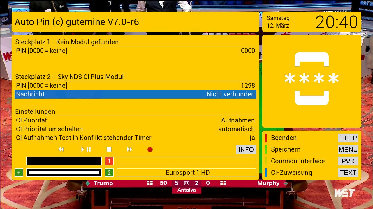 Daten: DM920UHD mit aktuellem Newnigma2; DreamCIPlus ist installiert, CI+-Modul von Vodafone, KD-31 Karte von Vodafone (KDG) , Installation in Slot2 der Dreambox