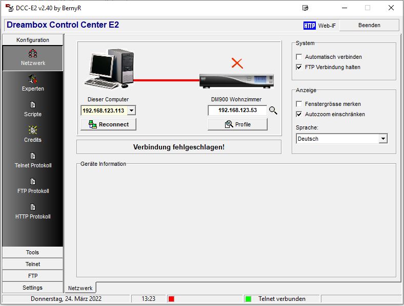 Deshalb habe ich nun die Box in den Rescue Mode versetzt und versucht sie von dort mit dem "Dreambox Control Center E2" zu erreichen.