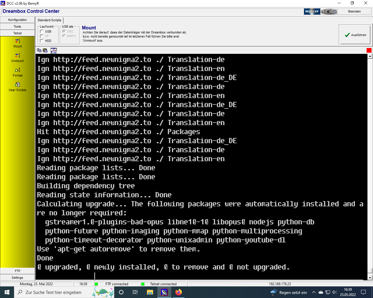 3 23. Mai 2022, 16:59 Dein Image ist aktuell. kannst ja auch mal auf der Box im Hauptmenü - Informationen - über nachsehen , da wird der Stand angezeigt. Der NN2 Feed wurde zuletzt am 01.05.22 gebaut. Seitdem gibt es ja auch nichts neueres ( deshalb kein update ) Um die nicht mehr benötigten Pakete zu deinstallieren über die Konsole den Befehl eingeben : apt-get autoremove Edit zu spät
