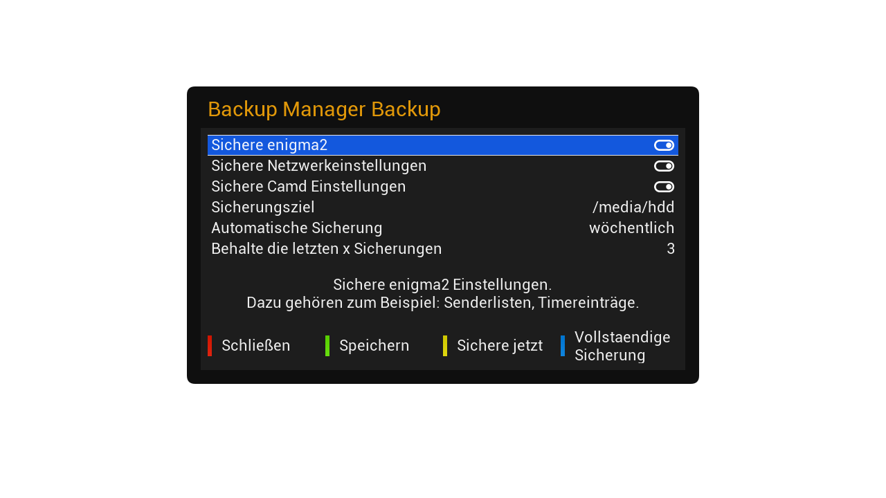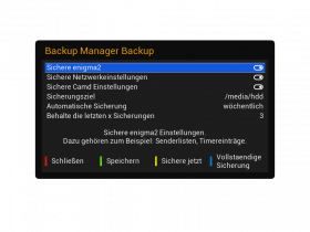 Das geht mit dem Sicherungsmanager (enigma2-plugin-newnigma2-backupmanager, online nachinstallierbar per Softwareverwaltung). Nach der Installation zu finden in Newnigma2Services > System Werkzeuge.