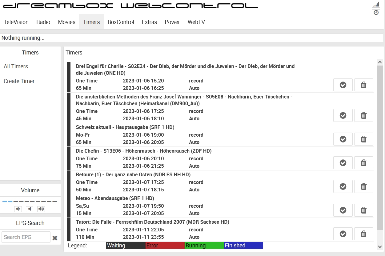 Wahrscheinlich sieht man das im Log. Ich habe einen Triple-Tuner verbaut. Mit A1 empfange ich 13° sowie 19.2° und mit A2 13° sowie 28.2°. Das funktioniert soweit auch einwandfrei. Aber (und das ist nur ein Beispiel von Dutzenden) als ich vorhin den Timer für einen Tatort am 11.1.2023 um 22:05 setzen wollte reklamiert diese Sanity-Routine, dass das nicht ginge. Ich habe dann den Timer vom 7.1.2023 um 17:25 (Retoure 1) deaktiviert um den Timer für den Tatort gesetzt zu bekommen. Das hat dann funktioniert.