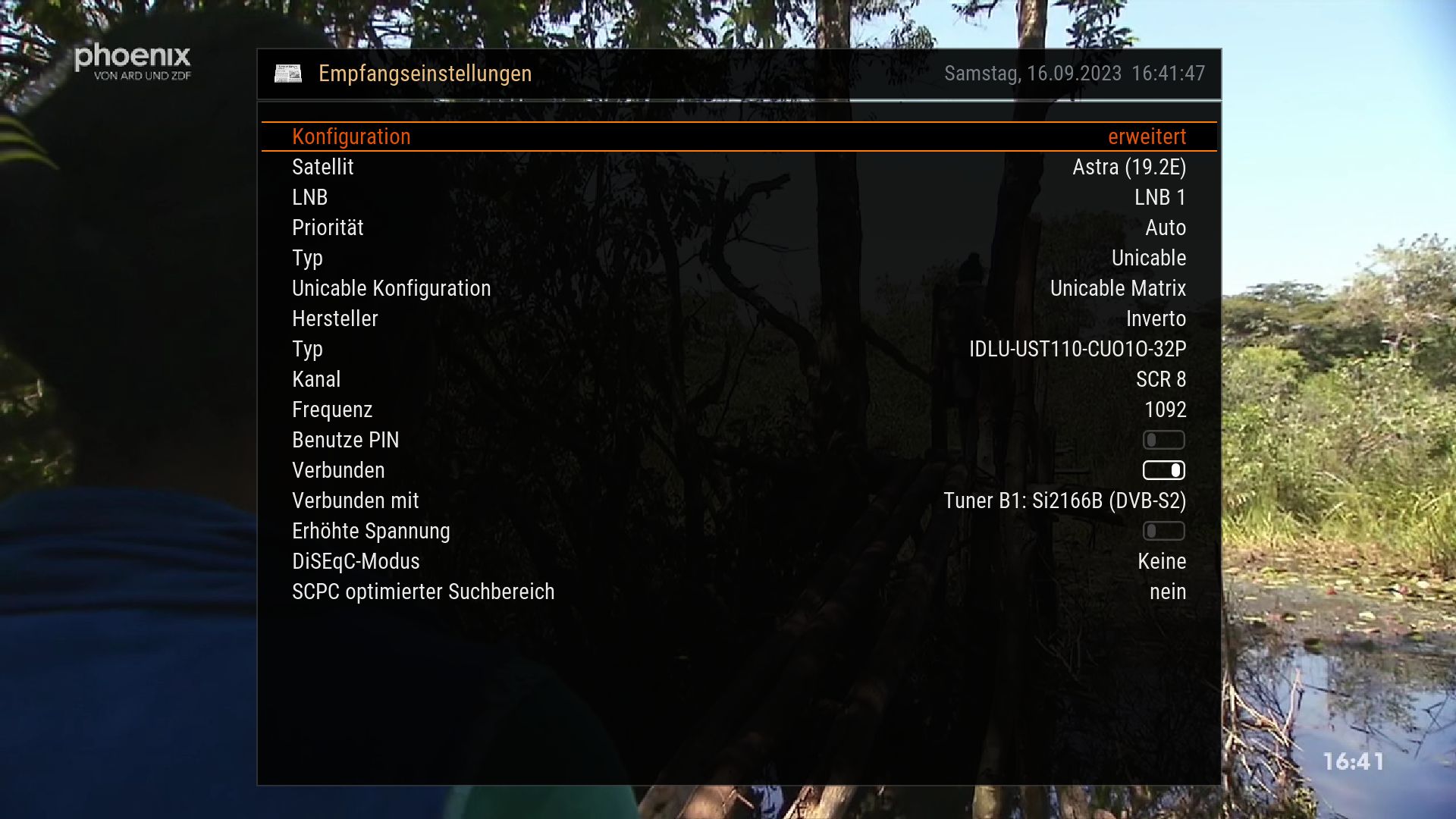 ich habe die Dreambox 7080HD - über einen 2-fach Splitter an A1 und B1der 7080 - an den Inverto Unicable II Multischalter IDLU-UWT110-CUO10-32P angeschlossen. In der Erweiterten Tunerkonfiguration kann ich das Invertermodell nicht finden und habe deswegen ein hoffentlich ähnliches : IDLU-32UL40-UNB00-0PP, das offensichtlich die gleichen Frequenzen hat, ausgewählt. Ich habe ein Quattro-LNB, in der Tunerkonfiguration aber Unicable-LNB ausgewählt, ist das ok ? Je Tuner A1, B1, kann ich nur eine SCR-Frequenz auswählen, jedoch nicht mehrere. Wie muss ich die A2,B2-Tuner konfigurieren (die einen sagen abschalten, die anderen wieder A2 wie A1, B2 wie B1.) Wie viele Sender kann ich max. gleichzeitig empfangen und kann/soll ich einen 4-fach Splitter verwenden und alle 4 Tuner mit diesem verbinden. Falls ja, wie dann A2 und B2 konfigurieren ? Wenn ich A2 und B2 statt auf inaktiv auf erweitert setze, und andere SCR-Frequenz (kann ja wohl nur eine je Tuner wählen) zuweise, ist es dann möglich mit dem 4-fach Splitter 4 Sender gleichzeitig zu empfangen. (oder ev. mehr ?)