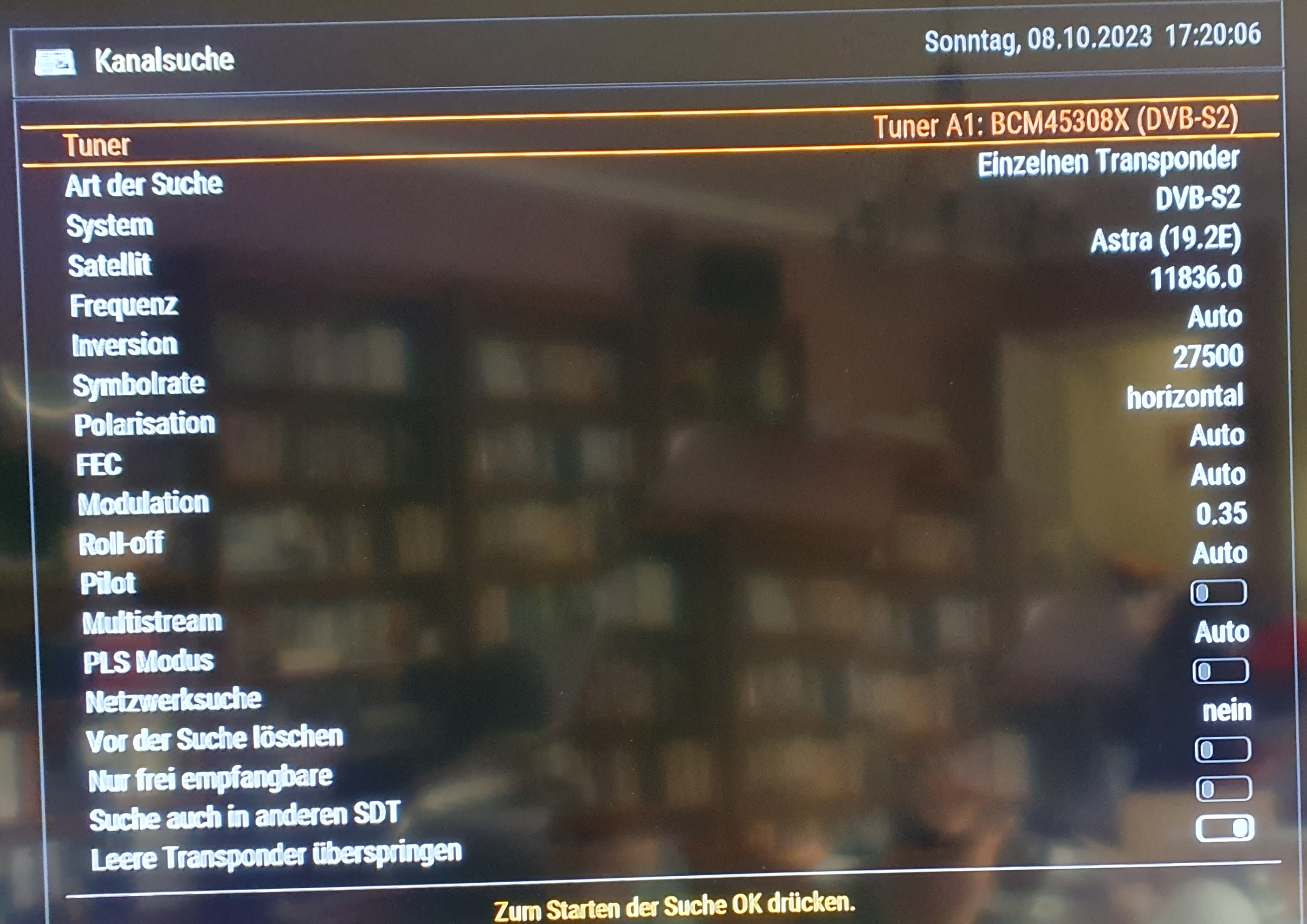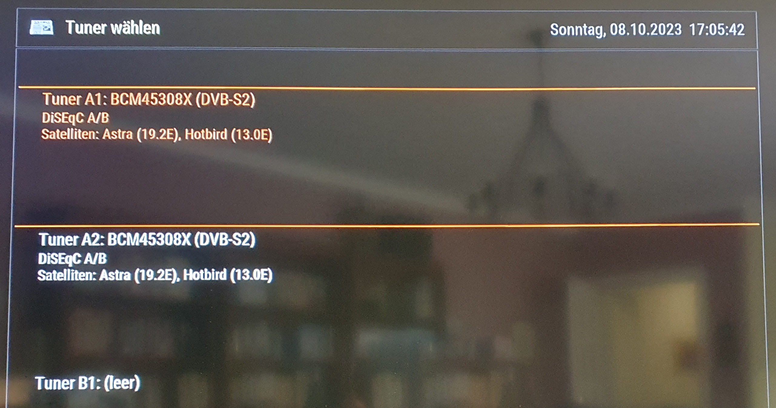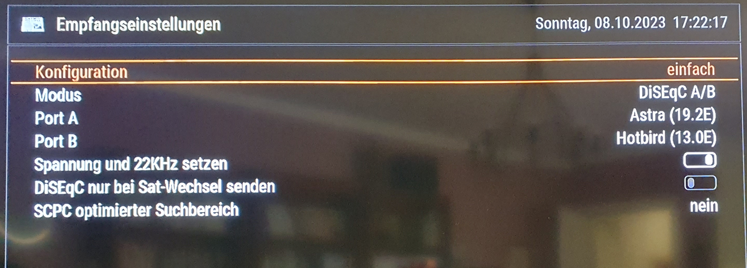 ich weiß gar nicht wo ich anfangen soll mit meinem Problem. Meine Schwiegermutter wohnt in einer Mietwohnung. Dort ist eine SAT Schüssel verbaut (siehe Bilder). Seit 2020 hat sie eine Dreambox DM920 UHD 4K 1x DVB-S2X Multistream FBC Twin Tuner, die bis vor ein paar Monaten ihren Dienst tadellos verrichtete. So nach und nach gab es immer wieder mehr und mehr Probleme mit "Kein Signal auf dem Transponder". Es schien so, als gäbe es ein Wackelkontakt an den F-Steckern, denn leichte Bewegungen führten wieder für ein paar Stunden am Tag zu Empfang bis es irgendwann gar nicht mehr ging. Daraufhin wurden die die beiden Stecker neue gecrimpt, die Box mal vom Strom genommen ... danach lief sie wieder für ein paar Stunden und nun nicht mehr. Da ich leider kein begnadeter Sat-Spezialist bin, weiß ich nicht, ob vielleicht Einstellungen nicht korrekt sind, o.Ä. und wo ich mit der Fehlersuche weiter machen könnte. Der SAT Finder zeigt die im Bild dargestellte Empfangsqualität an. Die Software wurde auch geupdated. Das Empfangsmodul wurde in der Box auch mal im 2. Steckplatz eingesteckt. Ist vielleicht der LNB defekt? Bei der Kanalsuche erscheint die Meldung, dass kein Kanal gefunden wurde. Hat jemand eine Idee, woran es liegen könnte?