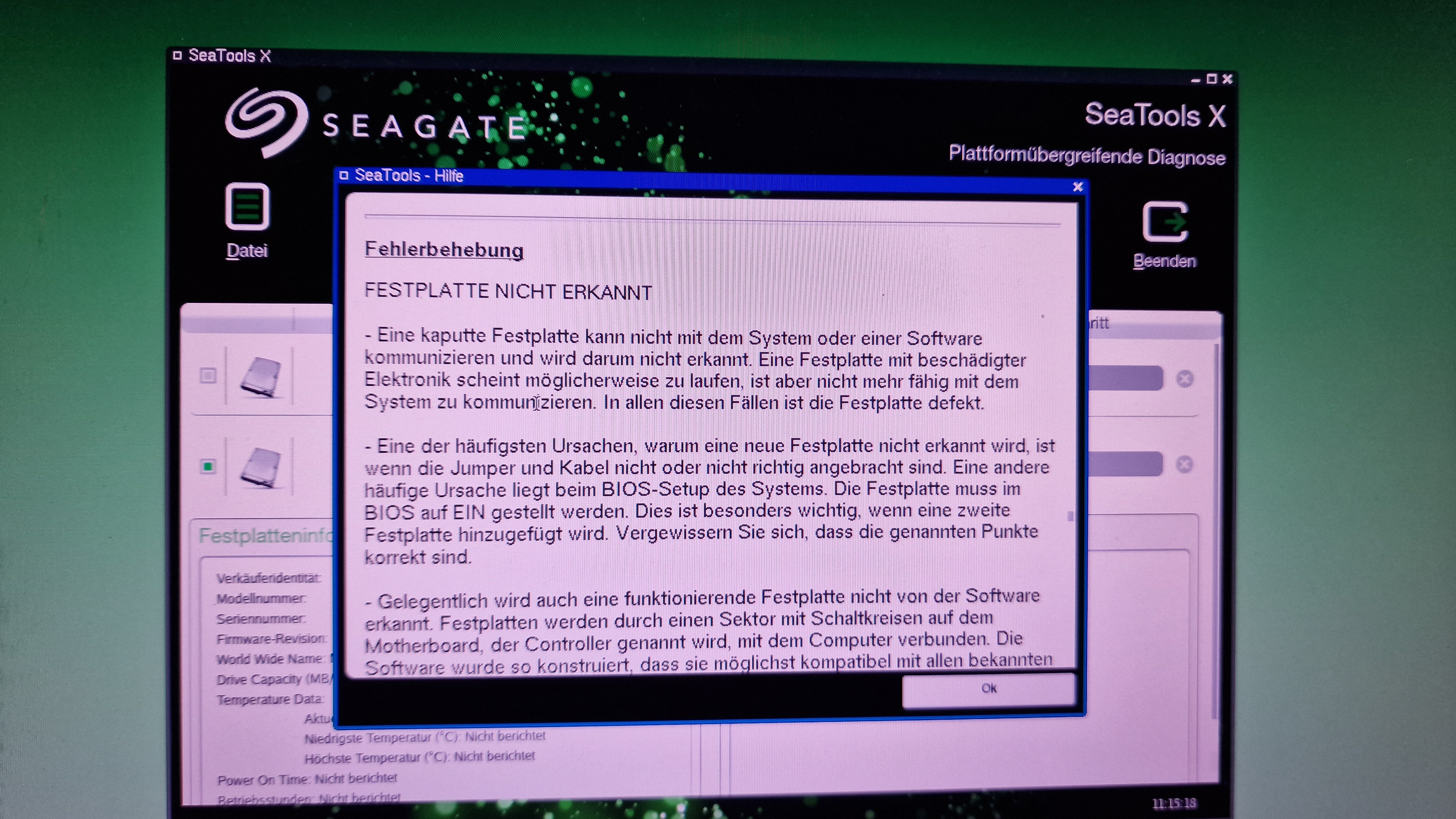 Wenn die Platte per USB angeschlossen ist und erkannt wird, hat eher der SATA Controller der Box einen weg. Aber ich tippe auch eher, dass die Platte einen Schuß weg hat
