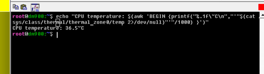- root@dm900:~# echo "CPU temperature: $(awk 'BEGIN {printf("%.1f\°C\n","'"$(cat /sys/class/thermal/thermal_zone0/temp 2>/dev/null)"'"/1000) }')" && echo "CPU temperature: $(awk 'BEGIN {printf("%.1f\°F\n","'"$(cat /sys/class/thermal/thermal_zone0/temp 2>/dev/null)"'"/1000*1.8+32) }')"