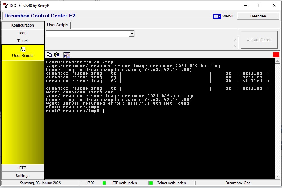 Anschließend habe ich die Netzwerkdaten manuell eingetragen und konnte per Telnet und FTP (mit DCC2) auf die Box zugreifen.
