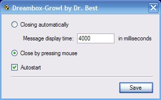 Das Programm wird in der Systray angezeigt, mit der rechten Maustaste kann man bei Configs noch Einstellungen vornehmen, wie das Message-Display sich verhalten soll und ob Dreambox-Growl automatisch nach dem Windows-Boot gestartet werden soll.