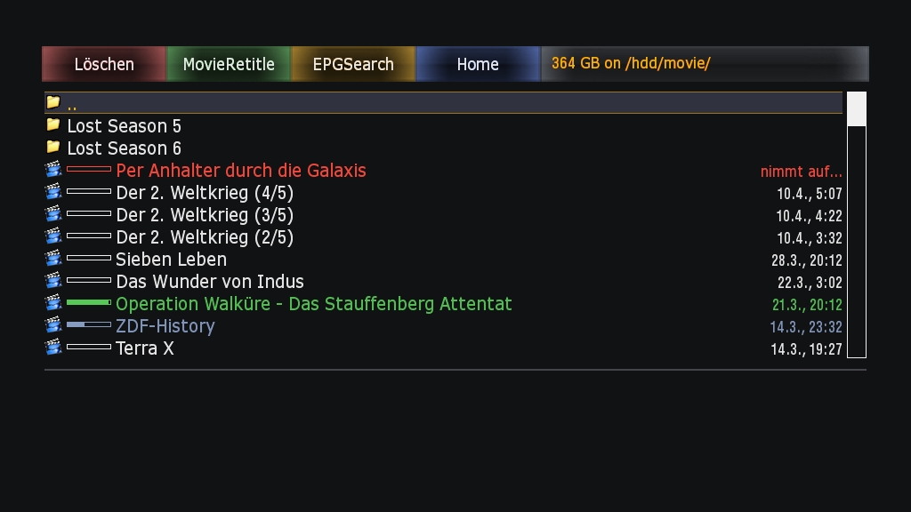 ich würde mir für die Movieanzeige, also die Übersicht der aufgenommenen Filme/Serien, eine Fortschrittsanzeige wünschen. Prinzipiell würde mir eine Anzeige genügen, ob der Film schon mal abgespielt wurde. Mit Ersterem hätte ich aber diese Anforderung auch erfüllt. Irgendwo wird ja ein Flag gesetzt, wo ich den Film zuletzt beendet habe --> Möchten Sie den Film an Position 01:23:45 fortsetzen ?
