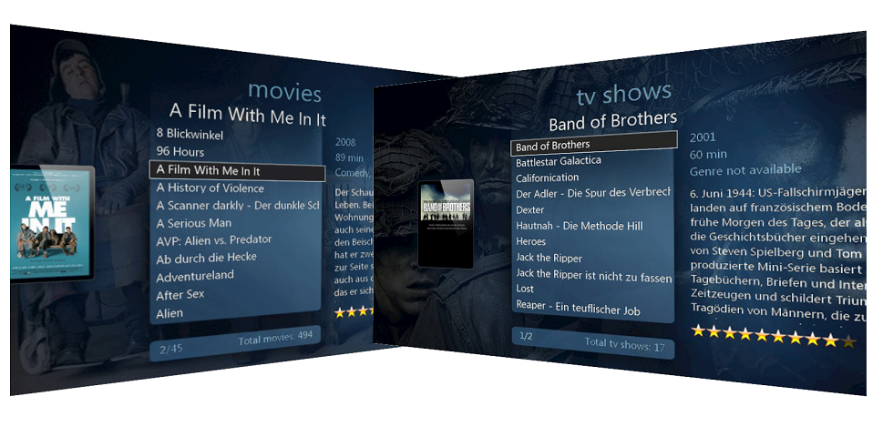 Es werden die angegebenen Verzeichnisse nach Filmdateien durchsucht und mit Einträgen aus IMDB, resp. TheMovieDB und TheTVDB wie Plot, Genre und Tagline sowie einem Cover und Hintergrundbild dargestellt.