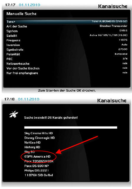 Mir fehlt z.B. ESPN AMERICA HD, da es beim automatischen Suchlauf nicht gefunden wurde. Mache ich einen manuellen Suchlauf, sieht es wie in den anhängenden Screenshots aus. Der Sender wird gefunden, ich geh aus der Suche raus, aber der Sender wurde nicht in der Senderliste gespeichert. X(